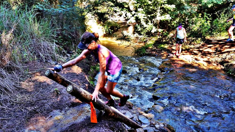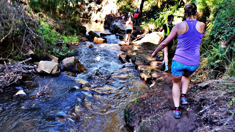 We then looped back around and began a long gradual descent back in the direction of the golf course and club house. Another short section on the paved roads led to the single track along the stream running down into the valley that splits the estate almost into two halves. This starts about 9km into the route with some rock hopping over a stream crossing by a small cascading waterfall and is followed by a well-defined trail beside the river. Short sections of loose and rocky terrain keep your mind engaged before passing in and out of forested patches, still in the valley. Ladders and bouncy bridges assist in crossing over the stream a number of times before finally emerging approximately 3km later at a sparkling dam and another waterpoint, this time serving only liquid refreshments.